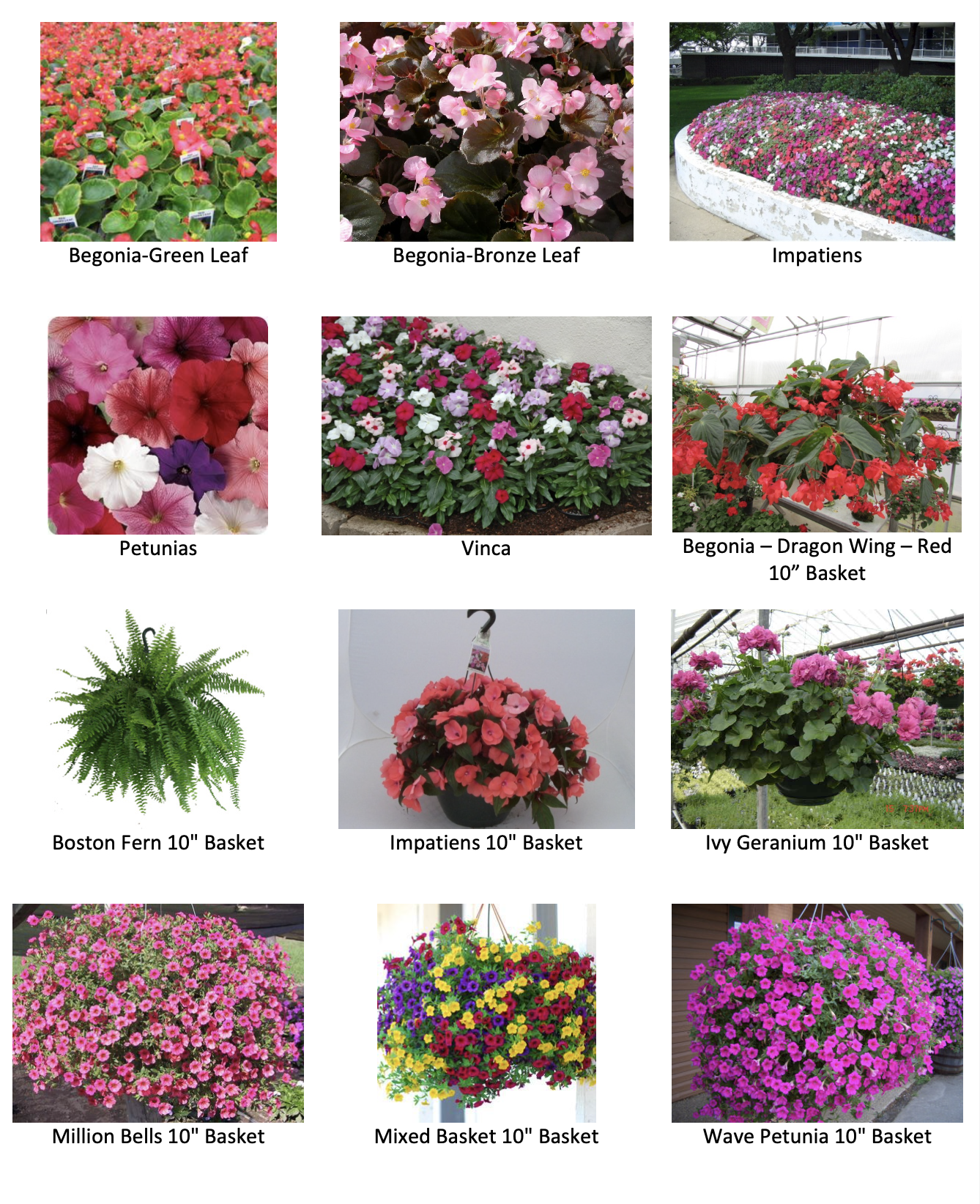 HANGING BASKETS: begonia (dragonwing red), boston fern, impatiens (red, pink, or salmon), ivy geranium (red, pink, or lavender), million bells (pink, purple, or red), wave petunia (blue, red, pink, or purple), or a mixed basket of assorted colors